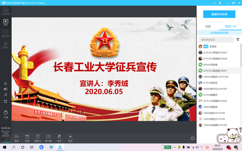 新闻网讯(通讯员陈思琦)为了充分调动青年学生应征入伍,献身国防的积极性,配合学校2020年征兵工作。6月8日,伟德国际victor1946举办2019级征兵政策宣讲会。会议由2019级辅导员李秀绒老师主讲,2019级全体学生参加了会议。
