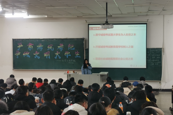 在2019级年级会上,李秀绒老师要求同学们牢记“诚信考试,拒绝作弊”,严格遵守考试制度,拒绝作弊行为,并结合学生手册相关内容开展警示教育。同时,李老师也深入了解同学们对各科的期末复习情况,对上一阶段无机化学测试成绩进行了总结。2017级、2018级也通过班团支部会、学生干部会等形式组织学生学习了刑法修正案第九条和学生手册关于考试纪律的相关条款,学院微信公众平台也推出了关于四六级考试及期末考试的纪律要求推文。