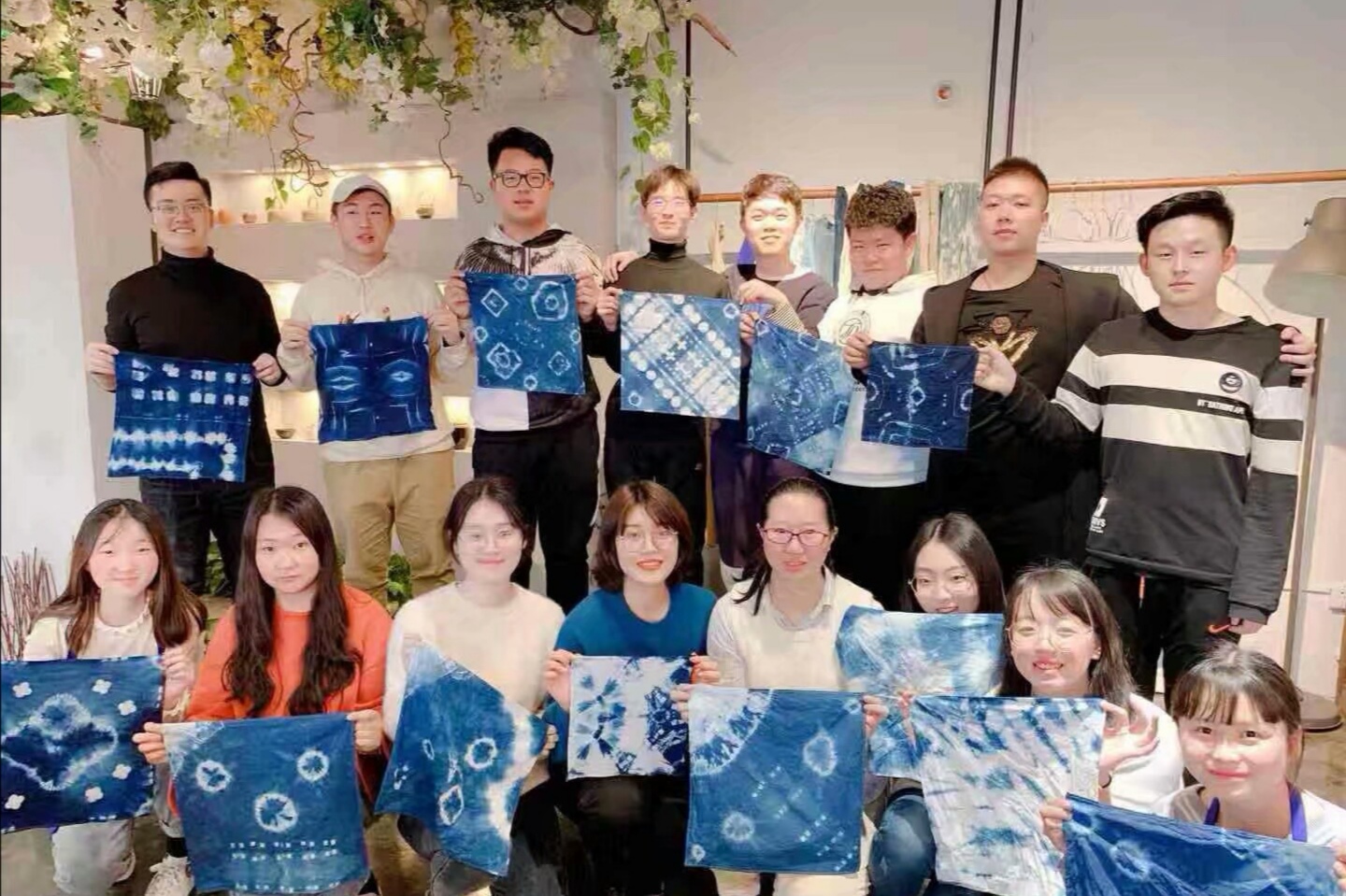 一行人在女生部谢雨慧同学的带领下准时到达活动所在地。现场同学们就被美轮美奂的扎染织物所吸引,这使得大家的热情瞬间高涨。随后,店内志愿者耐心地向他们讲述了扎染的文化内涵和所需要的染料、工具和步骤。经过志愿者的阐述,同学们对扎染有了初步的了解。同学们在志愿者的指导下,开始制作扎染作品。经过一番努力,一件件丰富多彩的作品诞生于此。活动在轻松愉悦的氛围中落下帷幕。