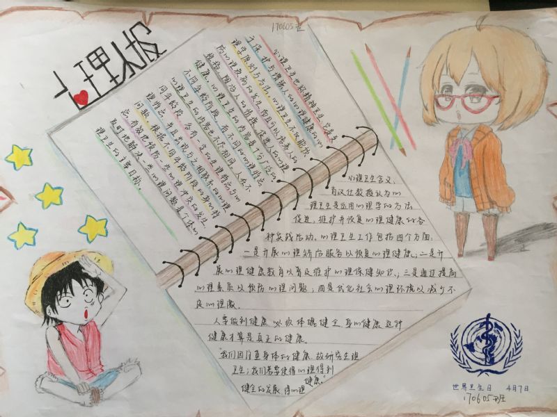 4月7日至10日,大学生心理素质提升计划之世界卫生日手抄报评比活动成功举行。此次活动共收到来自学院16级、17级学生手抄报30余份。经过评选,分别评出170605班等一、二、三等奖。通过手抄报比赛活动,进一步提升大学生身心健康素质的重视,以敬畏的心态对待自己的身心健康。