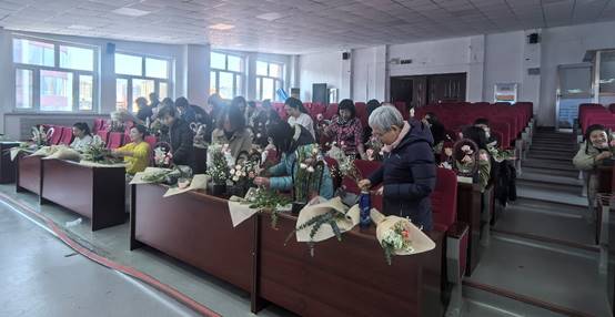 活动伊始,女教师们跟随专业花艺师教学视频,从花卉选择、色彩搭配到造型设计进行深入学习。女教职工们化身“花艺设计师”,以玫瑰、康乃馨、洋桔梗为主花,辅以尤加利叶、满天星等配材,精心创作独具匠心的插花作品。